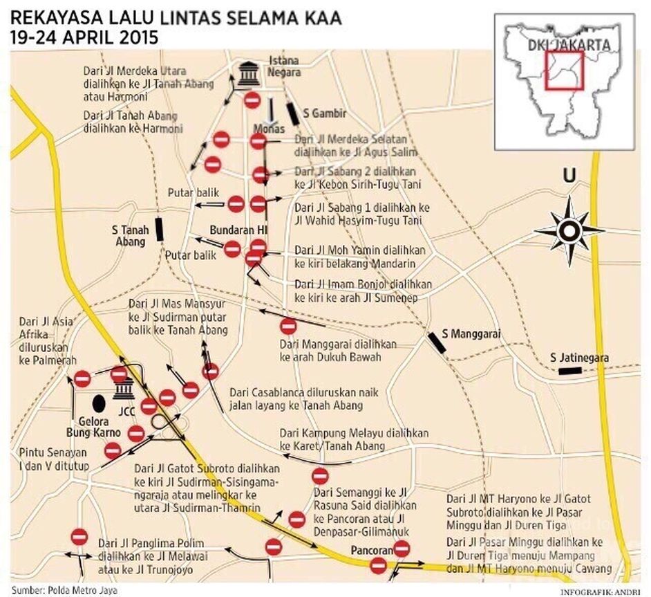 Berikut pengalihan arus lalu lintas saat puncak peringatan KAA pada Rabu besok: